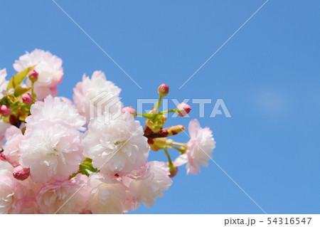 満開の八重桜(紅笠)のクローズアップ 【青空背景】