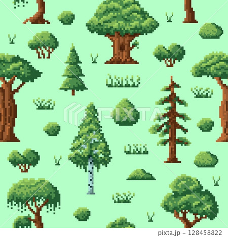Pixel trees and bushes seamless pattern. 8 bit game landscape, plants sprites, forest location, play design. Textile, wrapping paper, wallpaper. Print for fabric qualitative vector background