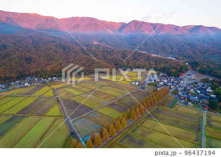 紅葉に染まる里山と冠雪した白馬三山のモルゲンロート 長野県白馬村(ドローンによる空撮)
