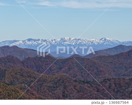 三国山脈の雪を抱く山並みと晩秋の自然風景