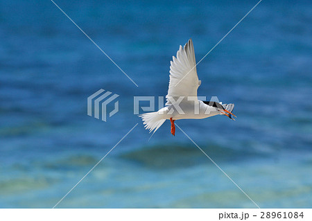 小魚をくわえながら気持ちよさそうに羽ばたくベニアジサシ