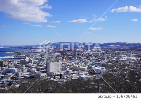 流氷展望台から紋別市街と紋別港を撮る。