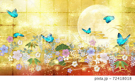 和風の花々と月と青い蝶々 金箔と赤の背景 横