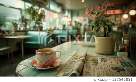 モダンヴィンテージな昭和のカフェ空間に映える陶器のカップと新聞、穏やかな時間
