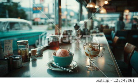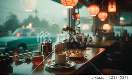 懐かしい雰囲気の純喫茶に並ぶメニューとカップ、レトロポップなテーブルと背景が魅力の朝
