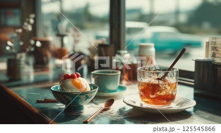 プリンと紅茶が並ぶ1980年代のカフェテーブル、昭和の穏やかな朝を再現