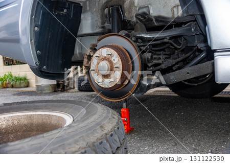 SUVをジャッキアップして夏タイヤを取り外したところ
