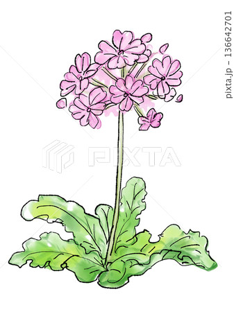 咲き誇るサクラソウの花の手描きの線画と水彩イラスト