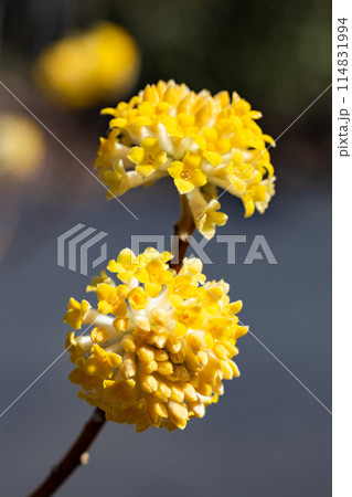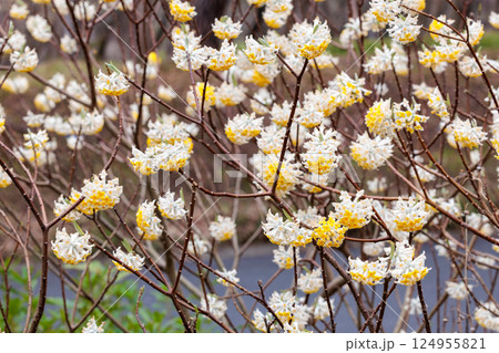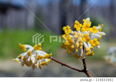 春の森に美しく咲く黄色系のミツマタの花