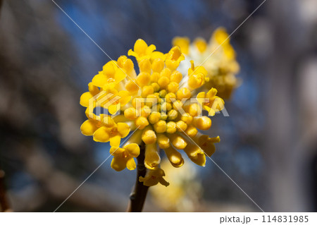 春の森に咲くミツマタの花のクローズアップ