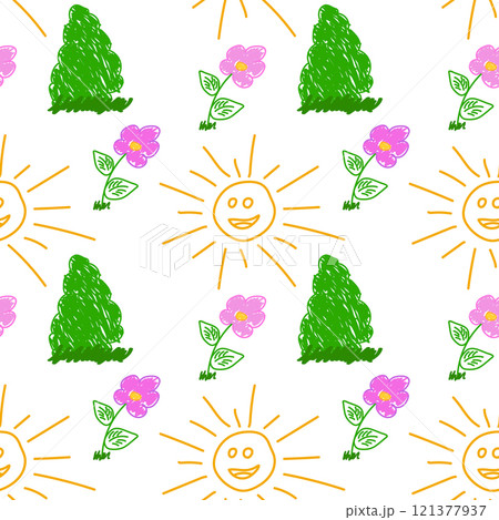 Cheerful Sun, Flowers, and Bushes Seamless Pattern