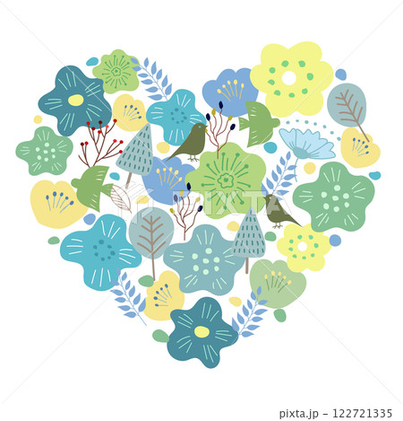 花や鳥の書かれた北欧風ハート模様のベクターイラスト