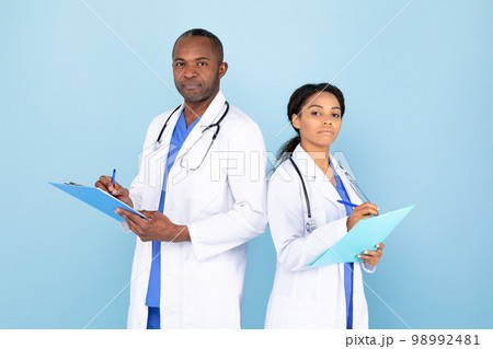 African american male and female doctors in uniform writing notes in clipboard, blue background