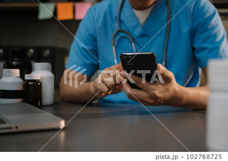 Doctor working with a tablet and smartphone search for medical information at the hospital office during the day.
