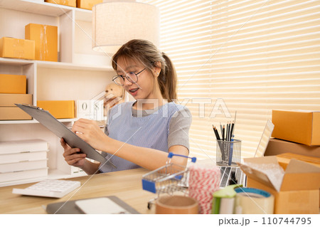 Check the product list, Online selling business, Small business owners are checking inventory in order to prepare them for proper delivery to customers, Working from Home.