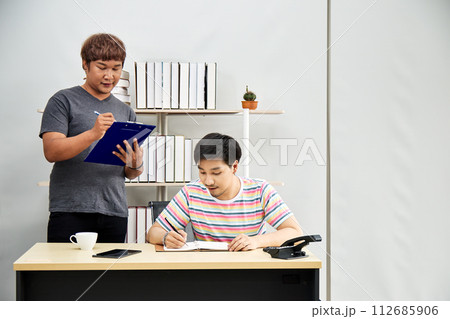 Supervisor taking note and explain to Employee writing memo on clipboard in Modern Office