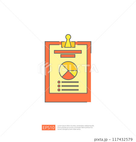 Red clipboard with yellow paper, featuring a pie chart, list, and title. Business concept, data analysis, reports, information.
