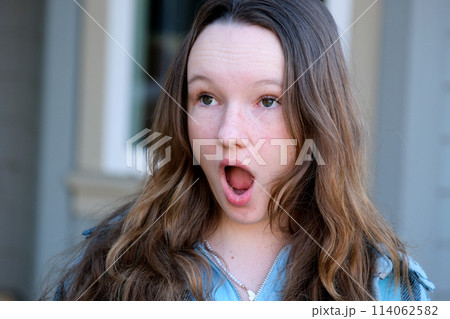 Beautiful european cute teen girl get surprised when look at copy space. Surprised happy beautiful woman looking copy space in exciting. use for your product, advertising.