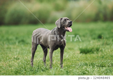 Standing on the green grass. Portrait of dog with short black fur that is having a walk outdoors at summertime