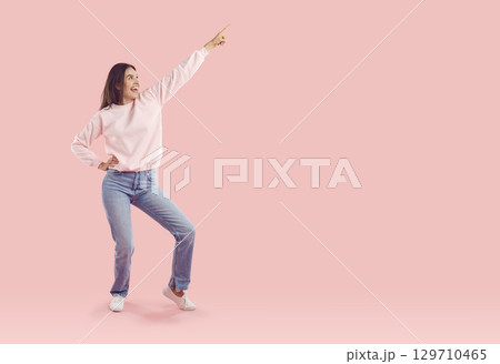 Young girl pointing her finger to the side at an empty space.