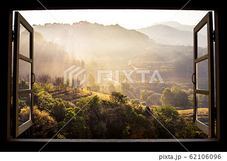 landscape nature view background. view from window at a wonderful landscape nature view with rice terraces and space for your text in Chiangmai, Thailand , Indochina