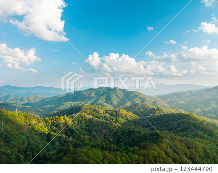 Landscape of forest and green mountains and clear sky in tropical winter.