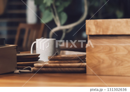 温かみのあるミニマリストなライフスタイル木と陶器のテーブル風景