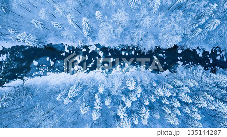 Aerial top down view of a snow covered winter forest with a frozen stream cutting through frosted pine trees. Minimal, serene winter landscape captured by drone in cold blue tones.