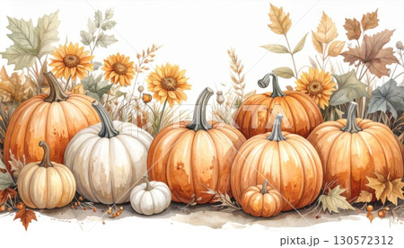 Autumnal Pumpkins with Sunflowers and Foliage in Watercolor Style Illustration on White Background