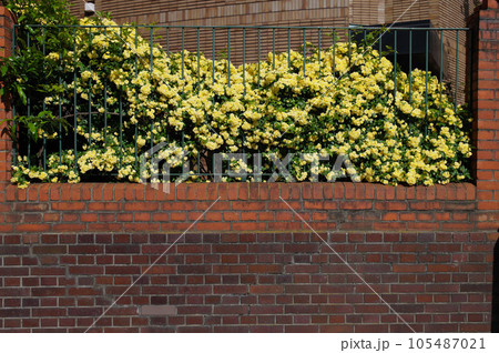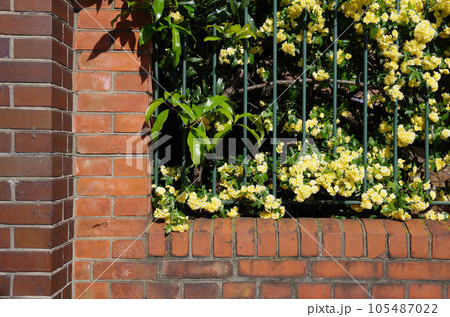 レンガ壁に鉄製フェンス黄モッコウバラ生垣1