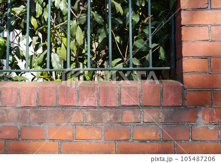 レンガ壁に鉄製フェンス緑葉1