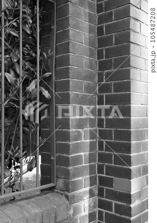 レンガ壁に鉄製フェンスの外壁モノクロ