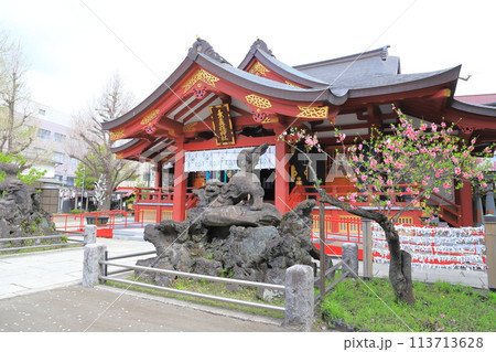 素盞雄神社(すさのおじんじゃ) 満開の桃の花と社殿