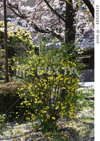 春の日本の公園に咲くウンナンオウバイの黄色い花