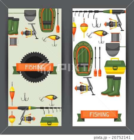 Fishing accessories. Different lures, rods, fish hooks, baits, plastic bucket with water for fish. Angling equipment and fisherman clothes, nowaday vector set