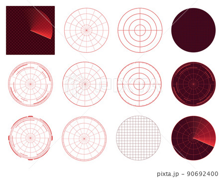 危険なレーダー画面のイラスト素材セット_赤_背景あり