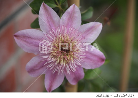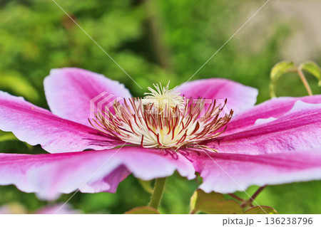 ピンク色のクレマチスの花が咲いています。学名はClematisです。