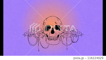 Image of skull with flowers over light spot on purple background