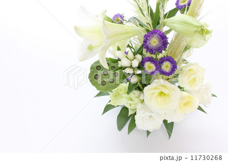 ハスの実の白色系アレンジ(縦 全体 ユリ上向き)
