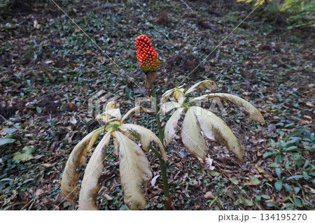 葉に斑が入ったマムシグサの実【有毒植物】/サトイモ科ナンテンショウ属