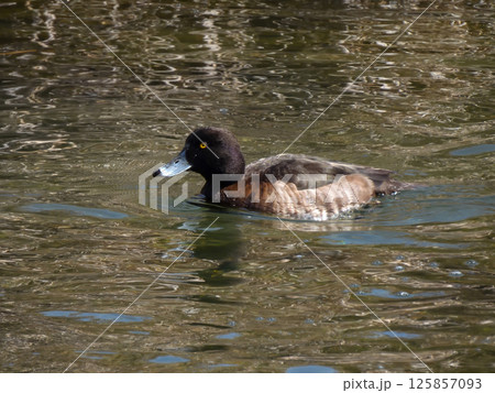 夕陽が反射した黄金色の水面を泳ぐカルガモのツガイ