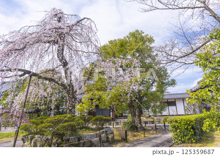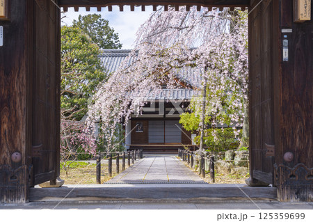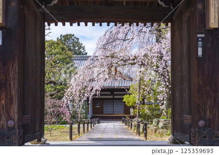 京都 上品蓮台寺 山門から見える玄関前の満開の枝垂れ桜