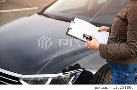 Female Stands By Automobile With Alcohol Tester And Clipboard. Preparing To Document Sobriety Check Results.