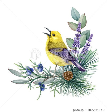 Winter floral decor with bright bird, eucalyptus, conifer. Watercolor illustration. Hand drawn nature style decoration with warbler, pine, eucalyptus. Wintertime cozy natural decor. White background
