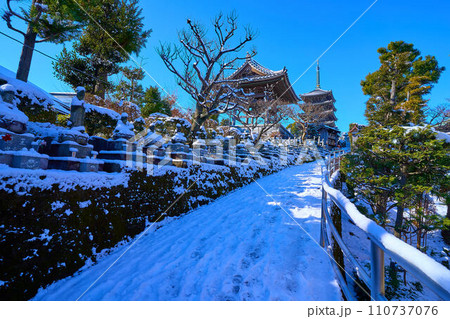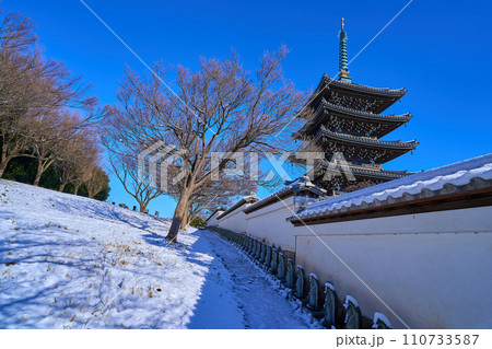 降雪後の神奈川県川崎市麻生区の香林寺の五重塔と観音