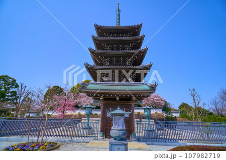 春の神奈川県川崎市麻生区の香林寺の五重塔と桜