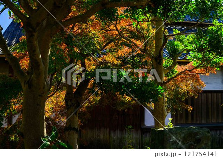 秋晴れ光芒を背景に映える秋の日本庭園 紅葉風景「旧細川刑部邸」竹あかり 限定公開 熊本市