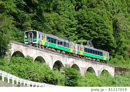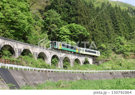 只見線「細越拱橋を走る列車と美しき山間部の緑」