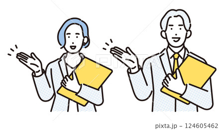 シンプル イラスト 案内するビジネスパーソンの男性と女性 人物セット