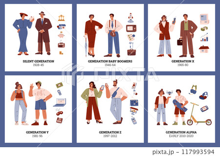 People generations card vector set, characters and symbols of Silent, Baby Boomers X, Y, Z and alpha social development
